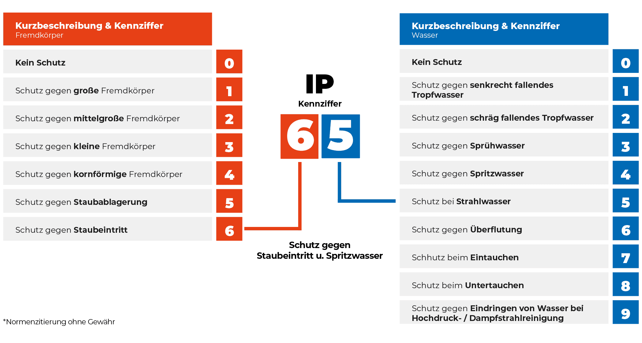 Der so genannte IP-Code stammt aus dem Englischen und bedeutet „Ingress Protection“. Die Schutzarten sind in der ISO 20653 bzw. DIN EN 60529 geregelt und bestehen aus 2 Kennziffern.